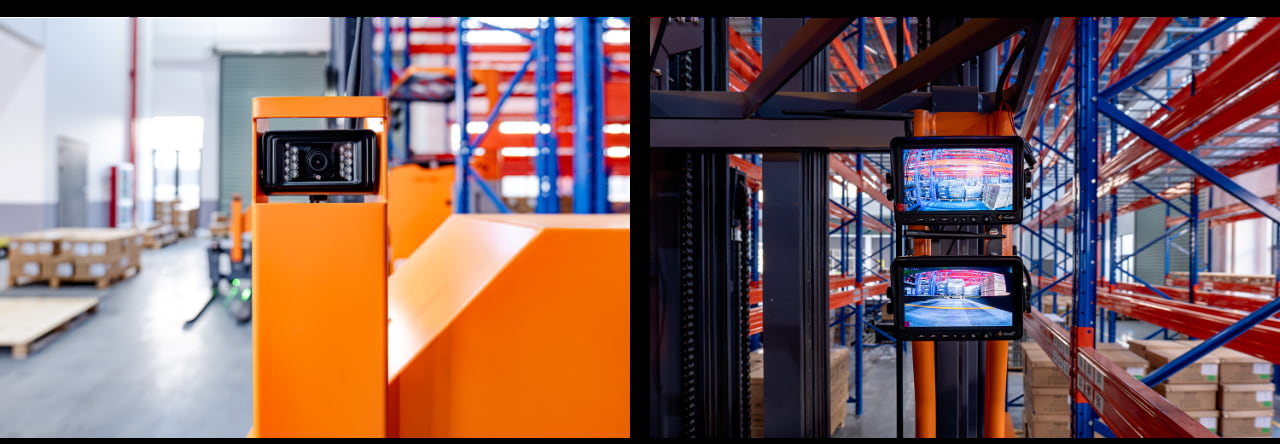 sont installées au niveau des fourches pour aider le conducteur lors des opérations de stockage et d'empilage.