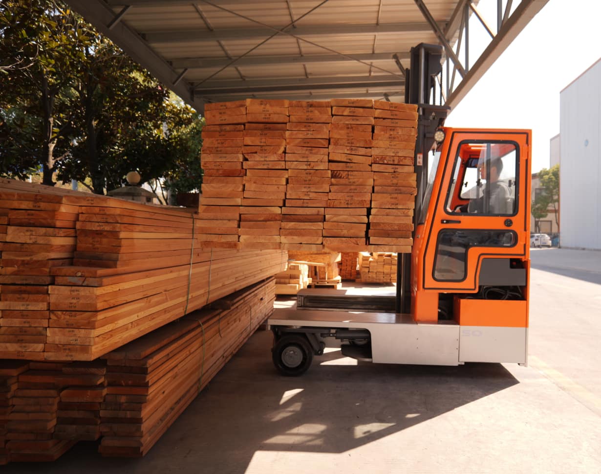 Auparavant, le client utilisait des chariots élévateurs traditionnels ou importés pour la manutention de matériaux longs. Cependant, ces solutions nécessitaient des allées larges, engendraient des coûts d'achat et de maintenance élevés et manquaient de flexibilité pour la manutention de pièces de bois de très grande longueur dans des entrepôts étroits.